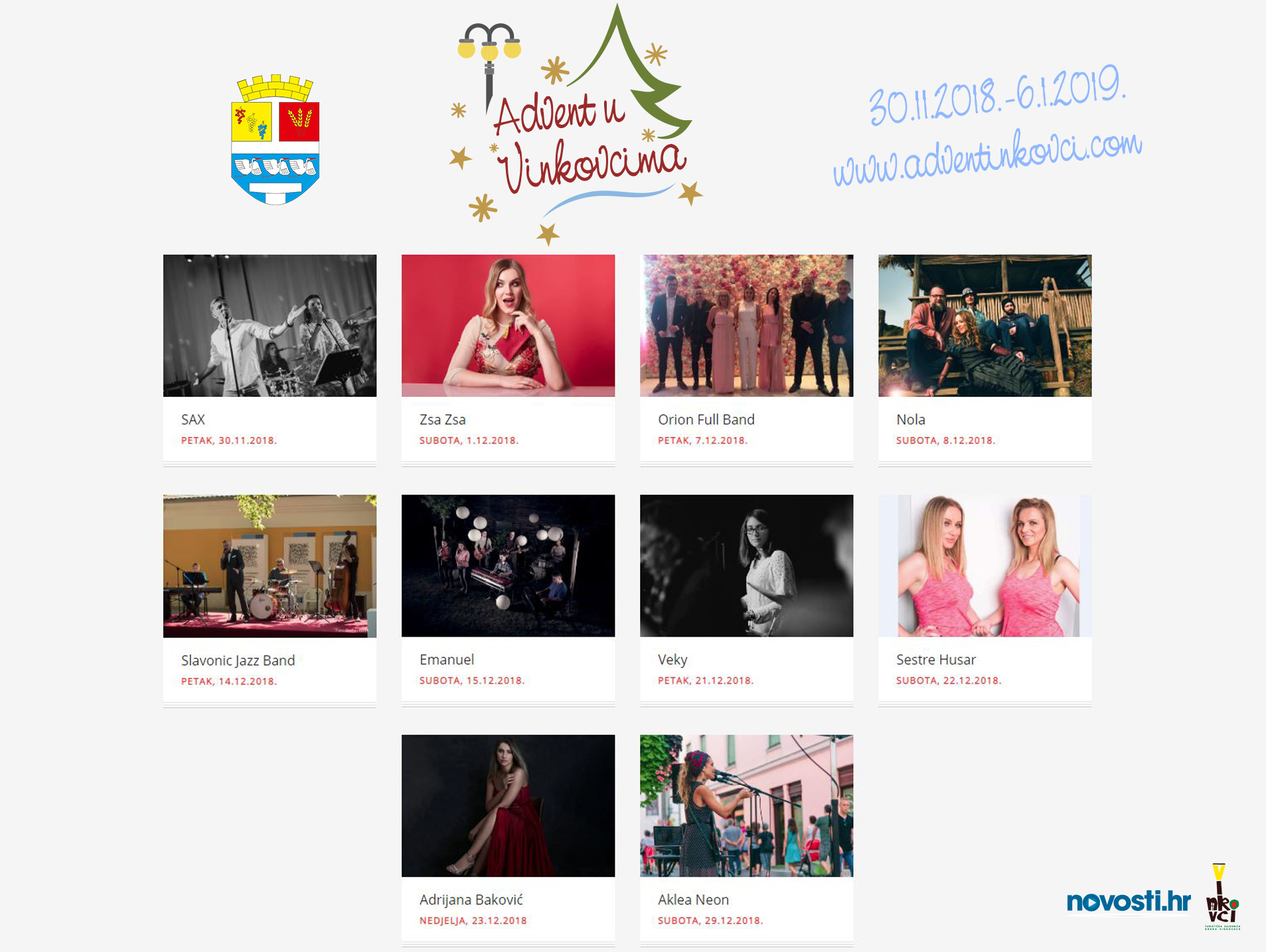 Prvog dana Adventa zabavljat će nas grupa Sax, dok sutradan, prvog dana prosinca, u Vinkovce se nakon Vinkovačkog ljeta vraća mlada kantautorica Zsa Zsa. Na blagdan svetog Nikole, 6. prosinca, pred publiku će stati raspjevani zborovi, njih prati Orion Full band, 7. prosinca, a kao vrhunac drugog adventskog tjedna, 8. prosinca, zapjevat će Nola.