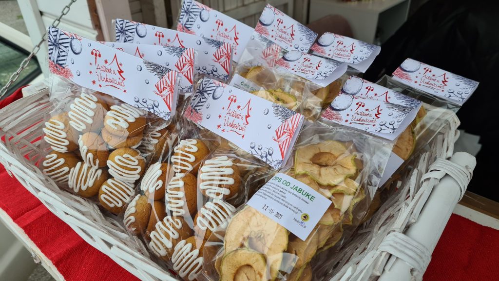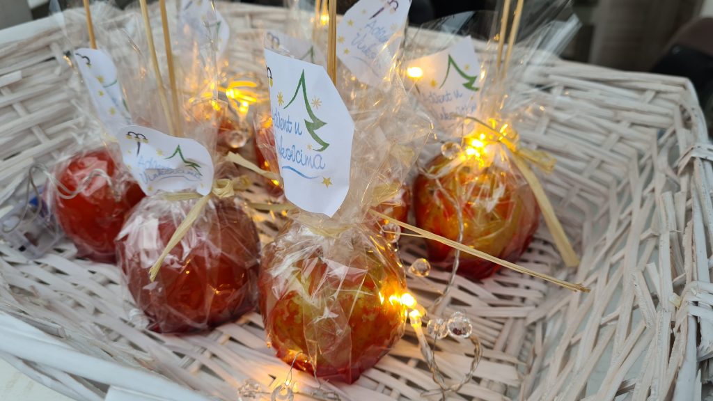 Na početku priče rekli smo kako je „Bončić-poklončić“ slatka kućica pa je vrijeme da to i potvrdimo – dobrodošli u svijet domaćeg meda, pekmeza, medenjaka i ušećerenih jabuka. Već dobro nam poznato OPG Pčelarstvo Ferbežar odlučilo je pokazati Vinkovčanima i njihovim gostima neke od svojih proizvoda zbog kojih su tako poznati pa na Bajku na Bosutu donose cvjetni med i med od bagrema. Iz OPG-a Slavica Dumandžić pobrinuli su se da ove zime uživate u slatkim medenjacima i pekmezu od jabuke i cimeta te dunje i jabuke, dok su vrijedni učenici Strukovne škole ponudili svoje ušećerene jabuke. Njihovi školski kolege „prekoputa“, točnije iz Poljoprivredno šumarske  škole, jabuku su iskoristili malo drugačije pa na kućici tako pronađite i čips od jabuke.